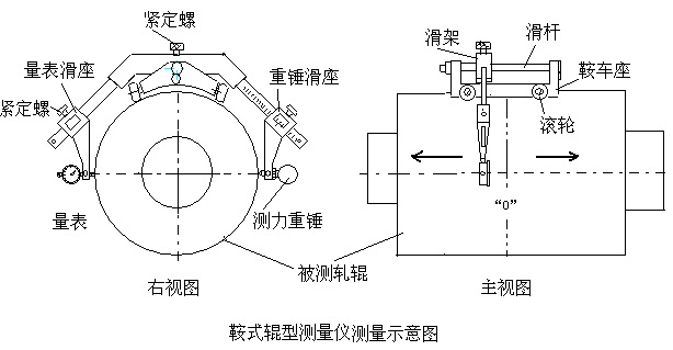 首先根據(jù)被測(cè)軋輥的大小選擇測(cè)量范圍合適的馬鞍儀,然后對(duì)儀器進(jìn)行調(diào)整,鞍式輥形測(cè)量?jī)x的測(cè)量示意圖如下所示: